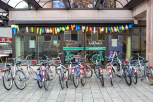 Hier werden gespendete Fahrräder angenommen, wieder flottgemacht und gegen eine Spende an Interessenten weitergegeben.