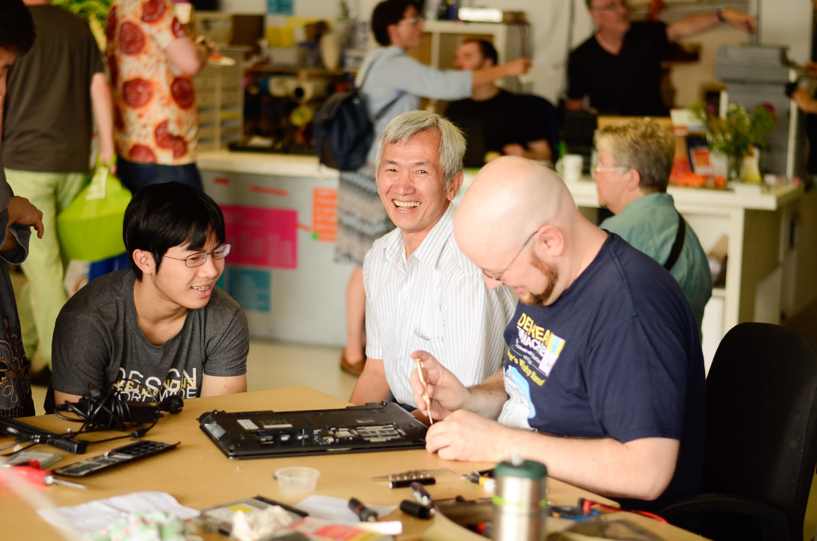 Hier werden kaputte Alltagsgegenstände wie z.B. Haushaltsgeräte, Fahrräder und Spielzeug zusammen repariert.